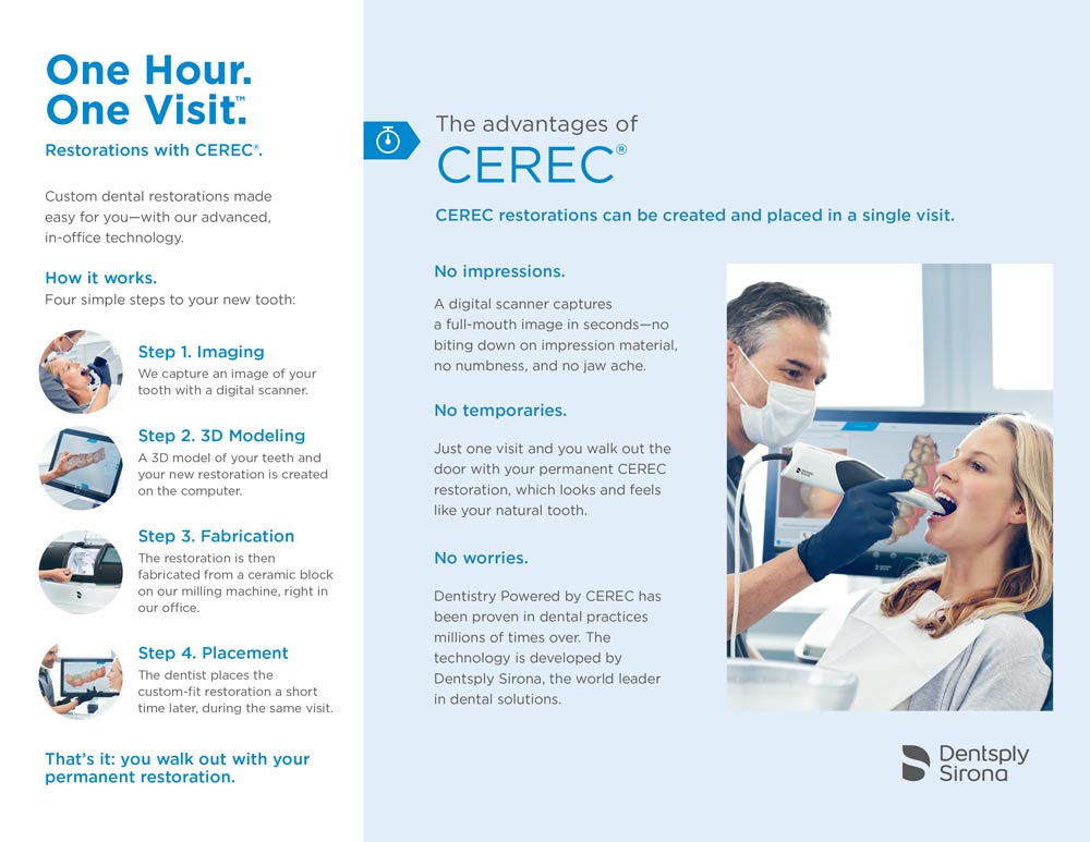 We're excited to offer Dentistry Powered by CEREC in our office - because it makes custom crowns, inlays, onlays, and veneers easier than ever for you. In just one visit using this advanced technology, we can prepare your tooth, then make the dental restoration right in our office in about one hour.